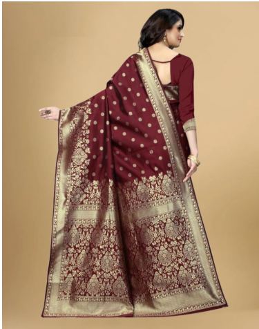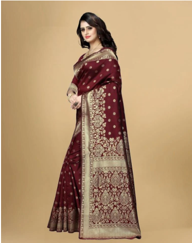 Elevate your ethnic wardrobe with the timeless charm of this Maroon Banarasi Silk Saree. Crafted with precision from luxurious silk, this saree is a masterpiece of traditional Banarasi weaving. The rich maroon hue exudes elegance, while the intricate gold zari work adds a regal touch—perfect for weddings, festive occasions, or cultural celebrations.